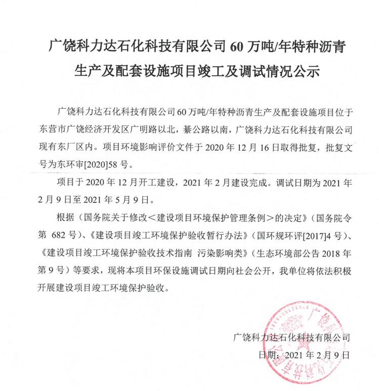 广饶科力达石化科技有限公司60万吨/年特种沥青生产及配套设施项目竣工及调试情况公示